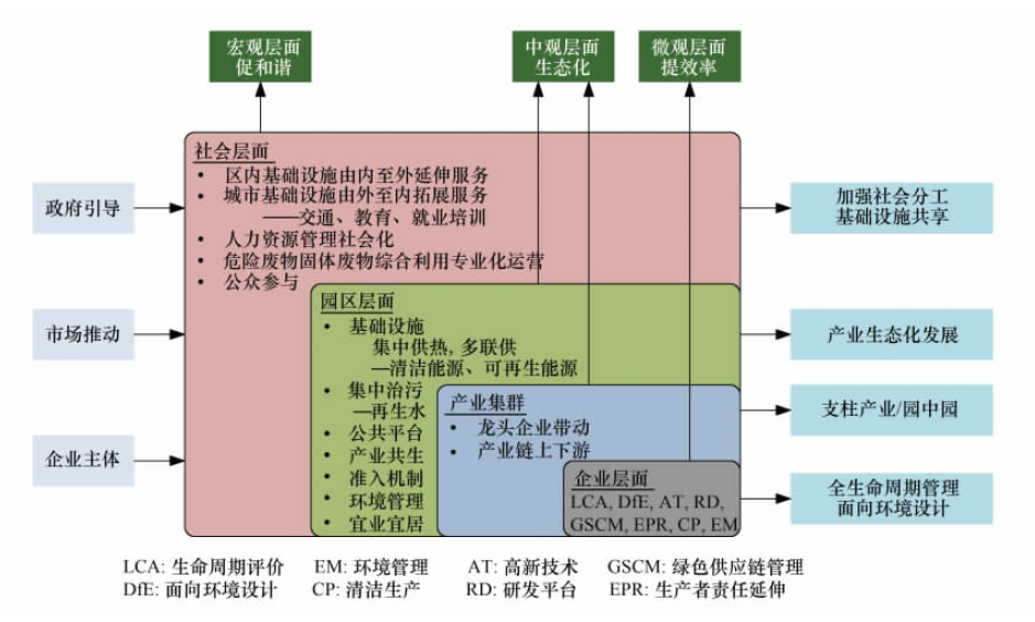 環(huán)保部組織出版了《中國生態(tài)工業(yè)園區(qū)建設(shè)模式與創(chuàng)新》,集中展現(xiàn)了多年以來國家生態(tài)工業(yè)示范園區(qū)的建設(shè)模式、特色與成效,總結(jié)梳理了一系列典型案例,并從6個方面凝練出現(xiàn)階段國家生態(tài)工業(yè)示范園區(qū)的主要建設(shè)模式,包括(1)企業(yè)層面以生態(tài)設(shè)計、綠色技術(shù)、節(jié)能降耗、環(huán)境管理為抓手推動生態(tài)化發(fā)展;(2)基于物質(zhì)代謝、水資源高效利用、能量梯級利用及基礎(chǔ)設(shè)施共享推進(jìn)產(chǎn)業(yè)共生發(fā)展;(3)老工業(yè)基地向高新技術(shù)轉(zhuǎn)型、二三類產(chǎn)業(yè)協(xié)調(diào)融合發(fā)展,及傳統(tǒng)制造業(yè)向戰(zhàn)略性新型產(chǎn)業(yè)轉(zhuǎn)型促進(jìn)產(chǎn)業(yè)轉(zhuǎn)型升級;(4)基于廢物循環(huán)利用的靜脈產(chǎn)業(yè)發(fā)展模式;(5)以流程工業(yè)為支柱且行業(yè)特征突出的園區(qū)集成創(chuàng)新實現(xiàn)資源能源高效利用;(6)在省會城市等大型城市布局的園區(qū)深化科技創(chuàng)新驅(qū)動生態(tài)產(chǎn)業(yè)發(fā)展。