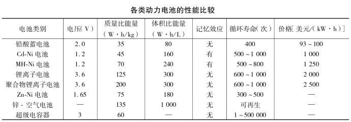 各類動(dòng)力電池的性能比較見下表: