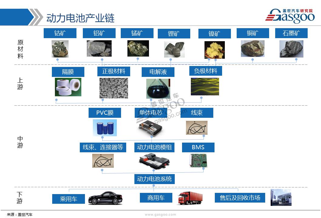 動(dòng)力電池產(chǎn)業(yè)鏈分為上、中、下游,從下圖中可以看到,上游包括鈷、錳、鎳、鋰以及石墨礦產(chǎn),也是當(dāng)下主流動(dòng)力電池原材料構(gòu)成。其中鋰礦應(yīng)用最為廣泛,而石墨一般只作為負(fù)極材料。中游產(chǎn)業(yè)鏈包括由正負(fù)極、電解液、隔膜、極耳加工形成電芯、PVC膜、線束。而下游產(chǎn)品則是電池模組、線束、連接器以及BMS管理系統(tǒng),整體形成動(dòng)力電池零部件。