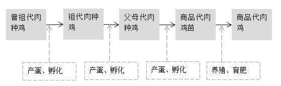 我國白羽肉雞祖代種雞養(yǎng)殖企業(yè)主要從國外引進祖代肉種雞苗,繁育父母代肉種雞苗出售給父母代肉種雞養(yǎng)殖企業(yè),父母代肉種雞產(chǎn)蛋孵化出商品代雛雞銷售給代養(yǎng)戶,商品代肉雞經(jīng)屠宰加工后成為雞肉產(chǎn)品。白羽肉雞的目標客戶主要是肯德基、麥當勞等快餐消費及分割產(chǎn)品出口。