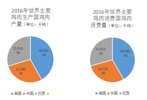 從地區(qū)分布上看,世界前三大雞肉生產(chǎn)和消費國家為美國、中國和巴西。美國為世界雞肉第一大生產(chǎn)國。根據(jù)wind數(shù)據(jù)統(tǒng)計,2016年,美國雞肉生產(chǎn)量達18261千噸;中國雞肉生產(chǎn)量達12300千噸;巴西雞肉生產(chǎn)量達12910千噸。2016年,美國、中國和巴西的雞肉消費量分別為18346千噸、12730千噸和12913千噸。