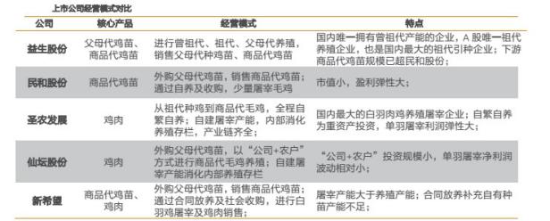 從2010年益生股份上市之后,A股就已經(jīng)有了完整了白羽肉雞產(chǎn)業(yè)鏈。目前共有5家上市公司——民和股份、益生股份、圣農(nóng)發(fā)展、仙壇股份、新希望——擁有相關業(yè)務。各家的側重點略有不同。