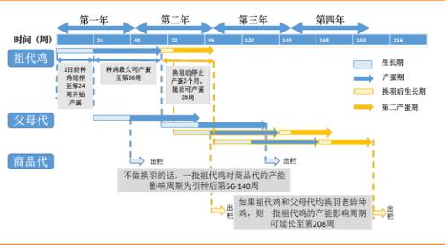 1)祖代1日齡引種,到24周進入產(chǎn)蛋周期,再經(jīng)過3周孵化,產(chǎn)出第一套父母代;