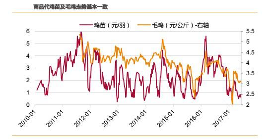 理論上,在產(chǎn)父母代存欄的變動,3周后將傳導到雞苗環(huán)節(jié)。但實際上,由于商品代離消費者最近,需求端的影響要大于供給端的影響。從數(shù)據(jù)上看,雖然商品代雞苗由于沒有庫存,產(chǎn)品價格波動幅度遠大于毛雞價格的波動幅度,但是兩者之間的走勢卻基本一致,間隔最多不會超過1周。因此,判斷毛雞價格走勢基本等價于判斷雞苗價格。
