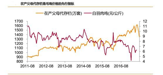 在產(chǎn)父母代存欄是商品代的直接產(chǎn)能,代表了中短期的供給能力。理論上,經(jīng)過3周孵化期+6 周育肥期后毛雞出欄,則在產(chǎn)父母代存欄是毛雞價格提前9-10周的先行指標,與毛雞價格走勢呈反相關。從實際運行來看,理論上走勢與實際走勢大體吻合。因此,在產(chǎn)父母代存欄是相對于毛雞價格提前兩個多月的先行指標。