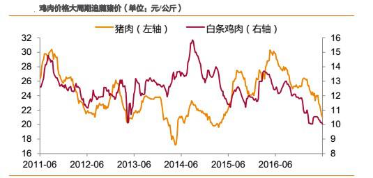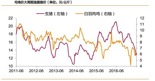 2)短周期內(nèi),受各自供求關系決定產(chǎn)品價格,則豬價、雞價走勢有可能會發(fā)生背離,但背離時間一般不會超過1個季度,且背離的時間一般出現(xiàn)在春節(jié)后的上半年。如2012年2月-4月,2014年2月-4月、2015 年3月-6月、2016年3月-6月、2017年2月-3月。