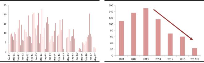2015年以來,祖代雞引種在持續(xù)收縮過程中,總量上基本得到了控制。美國、法國、西班牙等重要引種來源國相繼被封關,目前可以引種的國家十分有限。2017年上半年各品種共引進23萬套,比去年同期多出12萬套,主要是集中在今年1/2月份。
