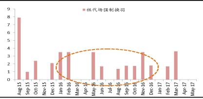 先看祖代存欄情況,我們對于引種量與存欄量之間做出三種情形分析:1)正常的產(chǎn)蛋周期,基本上從引種到淘汰約15個月,則16年3月份開始的引種逐漸進入淘汰期;2)淡季換羽,即在換羽時的雞價一般,通常在50周左右換羽,最終淘汰約在18個月,因此15年12月份開始的引種逐步進入淘汰期;3)旺季換羽,即在換羽時雞價較高,通常在第一產(chǎn)蛋周期結束后才做換羽,最終淘汰約在21個月,所以15年9月份開始的引種逐步進入淘汰期。