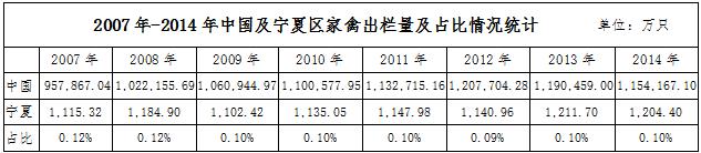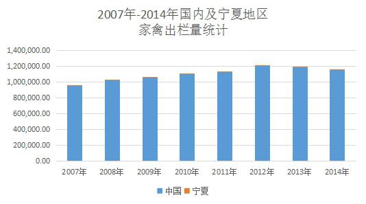 依據(jù)wind數(shù)據(jù),2014年全國家禽出欄量1154167.1萬只,寧夏地區(qū)家禽出欄量達1204.4萬只,占全國出欄量的0.1%。自2007年以來,寧夏地區(qū)的家禽出欄量一直以0.1%~0.12%的全國占比,市場占比非常小。