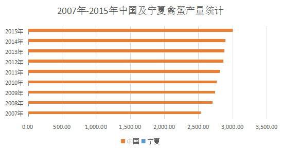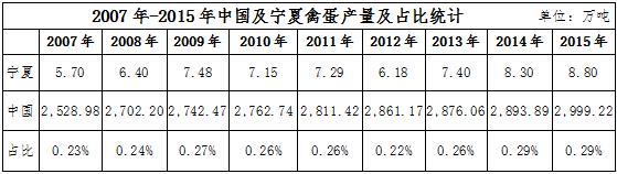 寧夏不僅是在出欄量上所占比重較低,在產(chǎn)量上也并不樂觀。2015年底,中國總體禽蛋產(chǎn)量為2999.22萬噸,而寧夏僅8.8萬噸,占全國的0.29%。2007年以來,寧夏禽蛋產(chǎn)量占比在0.23%~0.29%之間,2014年占比達到最高。