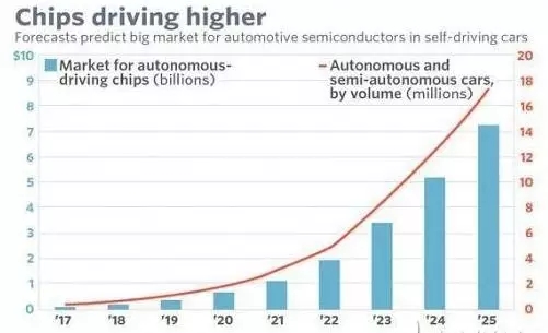 以無人駕駛汽車的智能化趨勢為例,摩根大通估計(jì)到2025年,用于無人駕駛汽車的半導(dǎo)體器件銷售額可達(dá)73億美元,從2017年到2025年的年復(fù)合增長率高達(dá)62.5%。2015年全球汽車半導(dǎo)體總銷售額不過300億美元,摩根估計(jì)平均每部車用到的芯片價(jià)值將從現(xiàn)在的300至400美元增長到2025年400至500美元。