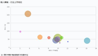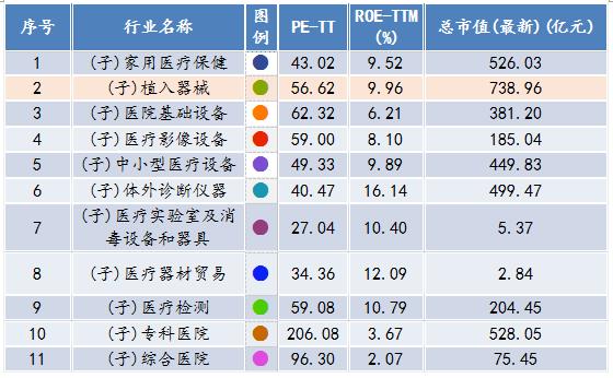 植入器械行業(yè)市盈率(PE)為56.62,其凈資產(chǎn)收益率為9.96%,相較其他行業(yè)而言處于中等位置;植入器械行業(yè)的總市值為738.96億元,相較其他行業(yè)而言,處于較高水平。