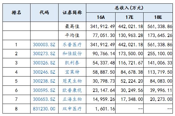 通過對(duì)植入器械上市公司的盈利做出預(yù)測(cè),上市公司總收入的平均值在2017年、2018年預(yù)計(jì)分別是130,963.28萬元、173,645.26萬元,相對(duì)于2016年的77,051.30萬元,呈現(xiàn)逐年增長的趨勢(shì);其上市公司盈利最高值預(yù)測(cè)值在2017年、2018年分別達(dá)到442,021.18萬元、561,338.86,相較于2016年的341,912.49萬元,呈現(xiàn)逐年增長的趨勢(shì),市場(chǎng)總體看好植入器械上市公司。