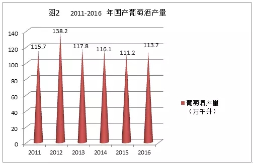 據(jù)國(guó)家統(tǒng)計(jì)局統(tǒng)計(jì),2011年-2016年國(guó)產(chǎn)葡萄酒產(chǎn)量見(jiàn)圖2。2012年底,我國(guó)規(guī)模以上葡萄酒企業(yè)(指年銷(xiāo)售額在2000萬(wàn)元以上的企業(yè))的葡萄酒產(chǎn)量達(dá)到138.16萬(wàn)千升,平均每五年翻一番,較2002年產(chǎn)量復(fù)合增長(zhǎng)率為16.98%。2013年,由于消費(fèi)市場(chǎng)的改變以及進(jìn)口葡萄酒持續(xù)沖擊的影響,我國(guó)葡萄酒行業(yè)景氣度下滑,產(chǎn)量降至117.8萬(wàn)千升,隨后兩年產(chǎn)量持續(xù)下降;2014年、2015年產(chǎn)量分別降至116.1萬(wàn)千升和111.2萬(wàn)千升;2016年,行業(yè)發(fā)展?fàn)顩r稍有回暖,產(chǎn)量增加了2.24%至113.7萬(wàn)千升。2007年1-5月,國(guó)內(nèi)葡萄酒產(chǎn)量同比增長(zhǎng)15.3%。