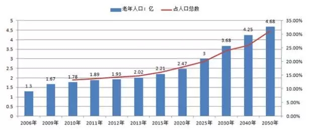 2004年底,中國60歲及以上老年人口為1.43億,2013年我國60歲及以上老年人口達2億人。截止2016年底,我國60歲以上的老齡人口高達2.3億人,位居世界之首。20世紀(jì)后期,為控制人口的急劇增長,國家推行計劃生育政策,使得人口出生率迅速下降,加快了中國人口老齡化的進程。由于下世紀(jì)前半葉人口壓力仍然沉重,還要繼續(xù)堅持計劃生育的國策,其結(jié)果將不可避免地使中國提早達到人口老齡化高峰。在第六次全國人口普查主要數(shù)據(jù)顯示,我國60歲及以上人口占13.26%,比2000年人口普查上升2.93個百分點,其中65歲及以上人口占8.87%,比2000年人口普查上升1.91個百分點,而且老年人口比例還以每年超過3%的速度增長,預(yù)計2025年將達到19.7%,到那時,每五個中國人就有一個是60歲以上的人。按國家統(tǒng)計局2005年出版的報告,現(xiàn)在出生的中國人,男性平均壽命是69.6歲,女性的預(yù)期壽命是73.5歲。