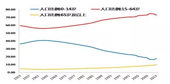 65歲以上老年人占總?cè)丝诘谋壤龔?%提升到14%,發(fā)達國家大多用了45年以上的時間。中國只用27年就可以完成這個歷程,并且將長時期保持很高的遞增速度,屬于老齡化速度最快國家之列。預(yù)計到2045年左右,中國60歲以上人口將占到總?cè)丝诘?0%。該過程發(fā)達國家用了100年。圖2為1953年到2013年60年的人口比例變化情況,中國的高齡化趨勢明顯。