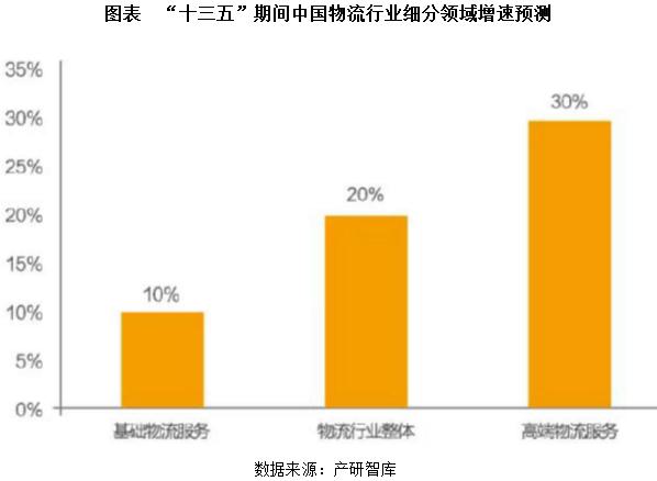 而高端物流服務(wù)增速將可以達(dá)到30%以上的增長(zhǎng)。供應(yīng)鏈管理、專業(yè)第三方物流和冷鏈服務(wù)等高端業(yè)態(tài)將迎來快速發(fā)展期,考慮到物流行業(yè)整體增速可以達(dá)到20%以及基礎(chǔ)物流服務(wù)增速僅在10%左右,預(yù)計(jì)“十三五”期間高端物流服務(wù)將可以迎來年均30%左右的持續(xù)增長(zhǎng)。