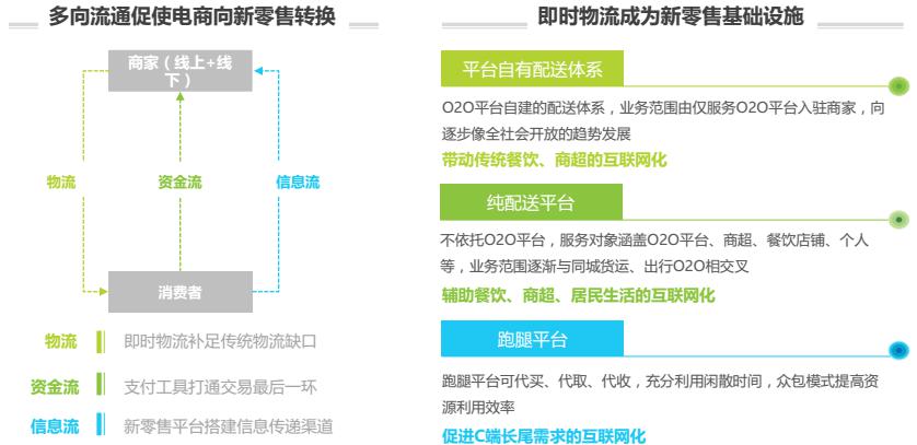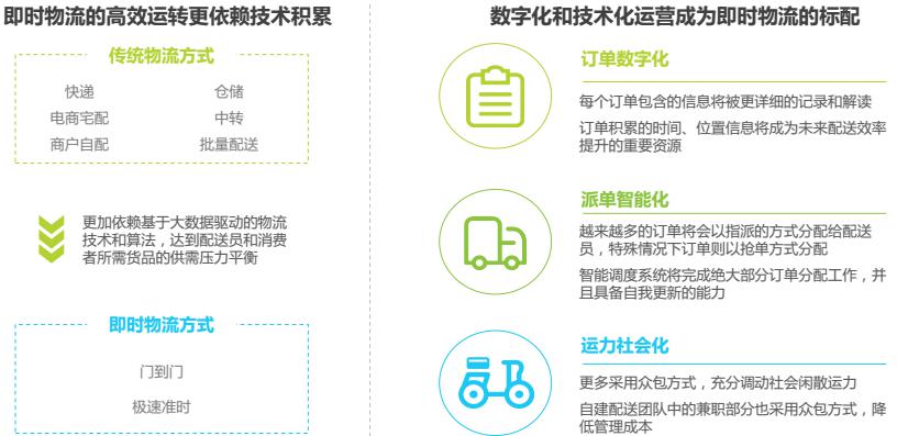 快速、及時(shí)、實(shí)時(shí)的物流實(shí)現(xiàn)路徑是“新零售” 的必備條件,即時(shí)物流在居民生活中扮演著越來越重要的角色,物流能力向下滲透觸及居民生活的方方面面,為衣食住行的全方位互聯(lián)網(wǎng)化提供現(xiàn)實(shí)基礎(chǔ),未來新零售趨勢(shì)下的即時(shí)需求比重會(huì)逐步增加。