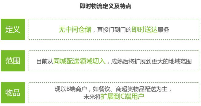 即時(shí)物流在餐飲外賣等行業(yè)有所涉及。2009年,“即時(shí)物流”概念由點(diǎn)我達(dá)創(chuàng)始人趙劍鋒提出。2016年8月,點(diǎn)我達(dá)接受阿里巴巴近10億元投資,“即時(shí)物流”概念廣泛傳播。2016年11月召開的互聯(lián)網(wǎng)大會(huì)上,美團(tuán)點(diǎn)評(píng)和餓了么相繼強(qiáng)調(diào)“即時(shí)配送”業(yè)務(wù)。區(qū)別于傳統(tǒng)物流方式,即時(shí)物流的核心特點(diǎn)在于即時(shí)性,滿足用戶提出的極速、準(zhǔn)時(shí)的配送要求。目前,即時(shí)物流以同城、小件領(lǐng)域切入,拓展到生鮮、商超配送領(lǐng)域,再逐步擴(kuò)展到更為廣泛的快遞末端領(lǐng)域。