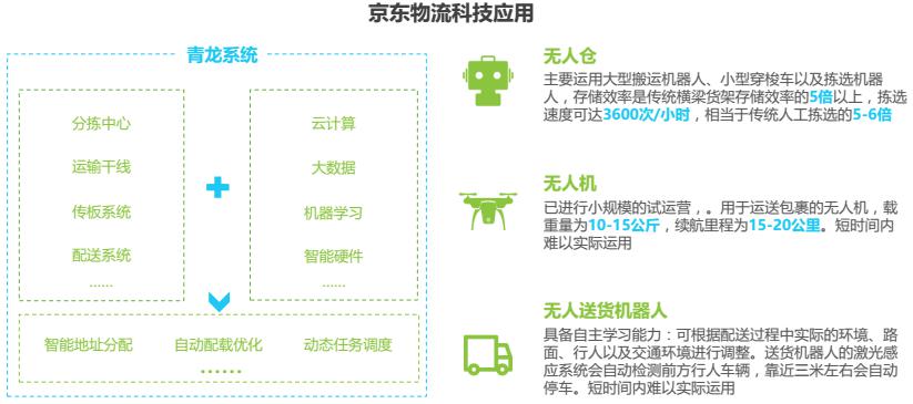 京東于2016年成立了X事業(yè)部,專注智慧物流相關(guān)技術(shù)的研發(fā)。2017年4月京東物流宣布獨(dú)立運(yùn)營(yíng),成立物流子公司。截止2017年6月,京東在全國(guó)范圍內(nèi)擁有256個(gè)大型倉(cāng)庫(kù),6906個(gè)配送站和自提點(diǎn),包括已經(jīng)運(yùn)營(yíng)了7個(gè)大型智能化物流中心“亞洲一號(hào)”。目前京東自營(yíng)配送覆蓋了全國(guó)98%的人口,壓縮商品流通成本70%,提升物流運(yùn)營(yíng)效率2倍以上。京東物流科技的應(yīng)用主要包括兩個(gè)方面,一是基于大數(shù)據(jù)預(yù)測(cè)分析技術(shù)實(shí)現(xiàn)智能化的調(diào)度、決策;二是采用一些更自動(dòng)化、智能化的設(shè)備提升物流效率,最終提升客戶的體驗(yàn)。