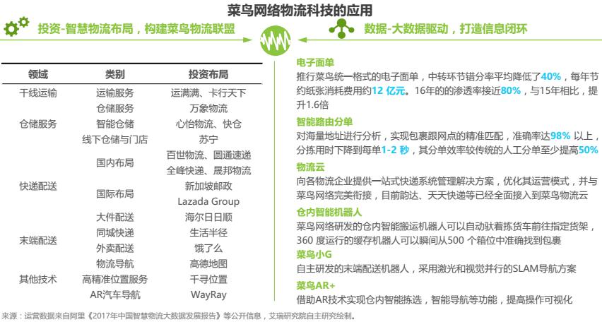 菜鳥網(wǎng)絡(luò)成立于2013年5月,定位于以數(shù)據(jù)驅(qū)動(dòng)、社會(huì)化協(xié)同的物流及供應(yīng)鏈平臺(tái)。主要業(yè)務(wù)有倉(cāng)配網(wǎng)絡(luò)、跨境網(wǎng)絡(luò)、快遞平臺(tái)和ET.物流實(shí)驗(yàn)室,以覆蓋全國(guó)的倉(cāng)配網(wǎng)絡(luò)和大數(shù)據(jù)決策平臺(tái)為基礎(chǔ),構(gòu)建專業(yè)高效的供應(yīng)鏈服務(wù)。為了提高網(wǎng)絡(luò)效率,一方面菜鳥以投資參股的形式構(gòu)建菜鳥聯(lián)盟,另一方面加大科技研發(fā)的投入,積極布局智慧物流。
