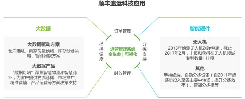 順豐速運(yùn)成立于1993年,截止2016年12月,順豐控股業(yè)務(wù)覆蓋全國(guó)331個(gè)地級(jí)市、2620個(gè)縣區(qū)級(jí)城市,近13000個(gè)自營(yíng)網(wǎng)點(diǎn)。順豐速運(yùn)業(yè)務(wù)包括國(guó)際業(yè)務(wù)、同城配送、冷運(yùn)、重貨(陸路&航運(yùn))等。順豐一貫重視在信息化領(lǐng)域的投入,負(fù)責(zé)集團(tuán)信息系統(tǒng)研發(fā)與運(yùn)維的科技人員超過2,000名,16年信息技術(shù)費(fèi)投入2.6億、占營(yíng)業(yè)成本0.57%,相較15年提升0.08個(gè)百分點(diǎn)。14-16年來,順豐控股申報(bào)和獲得的專利523項(xiàng),軟件著作權(quán)200多項(xiàng)。未來,順豐還將繼續(xù)擴(kuò)大在科技領(lǐng)域投入,不斷提高各方面的科技與智能化水平。