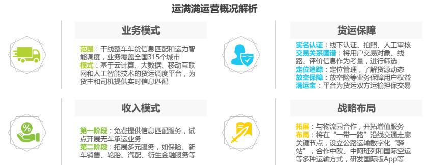 運(yùn)滿滿成立于2013年,是基于云計(jì)算、大數(shù)據(jù)、移動(dòng)互聯(lián)網(wǎng)和人工智能技術(shù)開發(fā)的貨運(yùn)調(diào)度平臺(tái),為貨主和司機(jī)提供實(shí)時(shí)信息匹配,減少貨運(yùn)空載率、提高物流運(yùn)行效率。由于模式相近,運(yùn)滿滿被業(yè)界稱為“貨運(yùn)版的滴滴”,成立3年來共獲得7輪融資,目前估值超過10億美金。截止2017年9月底,平臺(tái)實(shí)名注冊(cè)重卡司機(jī)400余萬、貨主100余萬,業(yè)務(wù)覆蓋全國(guó) 315 個(gè)城市。運(yùn)滿滿最新推出擔(dān)保交易產(chǎn)品“滿運(yùn)寶”,為貨運(yùn)雙方提供運(yùn)費(fèi)擔(dān)保。此外,運(yùn)滿滿還與阿里云、菜鳥、螞蟻金服、平安保險(xiǎn)、中國(guó)聯(lián)通、中國(guó)重汽等開展深度戰(zhàn)略合作,通過跨界融合,不斷推出創(chuàng)新產(chǎn)品和服務(wù)。未來,運(yùn)滿滿將借助人工智能、無人駕駛、區(qū)塊鏈等技術(shù)驅(qū)動(dòng),提供貫穿全產(chǎn)業(yè)鏈的線上線下服務(wù),構(gòu)建公路物流生態(tài)圈,打造綜合性的貨運(yùn)平臺(tái)。