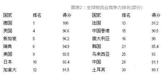 國(guó)家的物流業(yè)總體競(jìng)爭(zhēng)力不僅取決于基礎(chǔ)設(shè)施建設(shè)水平,還取決于整個(gè)物流產(chǎn)業(yè)的管理水平、第三方物流企業(yè)發(fā)展水平和第四方物流企業(yè)的整合能力。從國(guó)家層面來看,世界銀行發(fā)布的報(bào)告顯示,在全球物流業(yè)競(jìng)爭(zhēng)力排行榜(Logistics Performance Index)中,歐洲國(guó)家表現(xiàn)最為突出,前20名中超過60%的企業(yè)來自歐洲,亞洲物流業(yè)競(jìng)爭(zhēng)力最強(qiáng)的國(guó)家/地區(qū)是日本(排名第十),其次為中國(guó)香港和臺(tái)灣地區(qū),中國(guó)大陸在全球僅排名第28??傮w而言,發(fā)展中國(guó)家在基礎(chǔ)設(shè)施、國(guó)際運(yùn)輸、物流能力、交貨及時(shí)性等方面還與歐美等發(fā)達(dá)國(guó)家存在較大的差距,物流業(yè)的全球競(jìng)爭(zhēng)能力還十分有限。