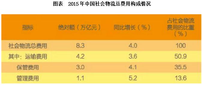 2014年社會(huì)物流總費(fèi)用10.6萬億元,同比增長(zhǎng)6.9%。社會(huì)物流總費(fèi)用與GDP的比率為16.6%,比上年下降0.3個(gè)百分點(diǎn)。其中,運(yùn)輸費(fèi)用5.6萬億元,同比增長(zhǎng)6.6%,占社會(huì)物流總費(fèi)用的比重為52.9%;保管費(fèi)用3.7萬億元,同比增長(zhǎng)7.0%,占社會(huì)物流總費(fèi)用的比重為34.9%;管理費(fèi)用1.3萬億元,同比增長(zhǎng)7.9%,占社會(huì)物流總費(fèi)用的比重為12.2%。