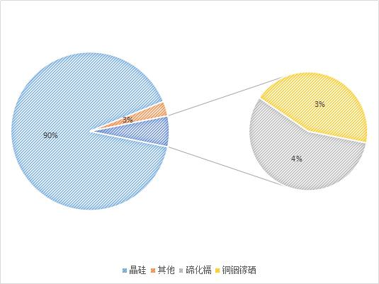 晶硅太陽(yáng)能電池約占市場(chǎng)份額90%;薄膜太陽(yáng)能電池占市場(chǎng)份額約10%,其中碲化鎘市場(chǎng)份額約4%,銅銦鎵硒約占市場(chǎng)份額3%。其他薄膜電池如軍工領(lǐng)域應(yīng)用較多的砷化鎵、目前無(wú)法規(guī)?;拟}鈦礦等太陽(yáng)能電池占市場(chǎng)份額約3%。碲化鎘目前90%的市場(chǎng)由美國(guó)薄膜電池制造商First Solar壟斷。