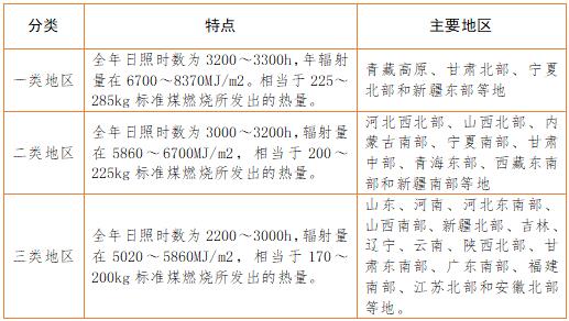 太陽(yáng)能資源的分布與各地的緯度、海拔高度、自然地理狀況和氣候條件有關(guān)。我國(guó)屬太陽(yáng)能資源豐富的國(guó)家之一,全國(guó)總面積2/3以上地區(qū)年日照時(shí)數(shù)大于2000h,根據(jù)中國(guó)氣象局風(fēng)能太陽(yáng)能評(píng)估中心推薦的國(guó)內(nèi)太陽(yáng)能資源地區(qū)分類辦法,共分5類,其中: