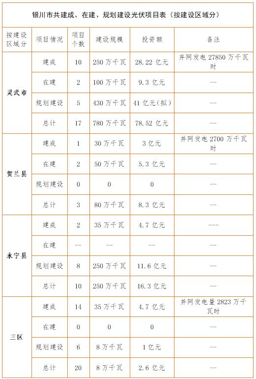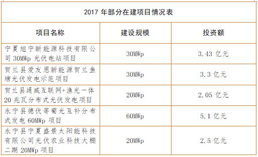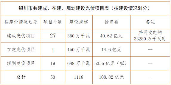 銀川市發(fā)改委項(xiàng)目資料顯示情況:截止2017年上半年,銀川市共建成、在建、規(guī)劃建設(shè)光伏項(xiàng)目50個(gè),建設(shè)規(guī)模1118萬(wàn)千瓦,投資約108.82億元。
