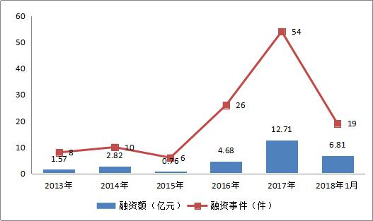 區(qū)塊鏈項目融資從2013年至2016年呈小幅上漲趨勢。由于2015年的政策監(jiān)管,導(dǎo)致2015年區(qū)塊鏈的投資熱度有所下降,在2017年VC大舉入局,投資額達12億。2018年1月,區(qū)塊鏈行業(yè)融資額和融資事件已經(jīng)超過2016年。