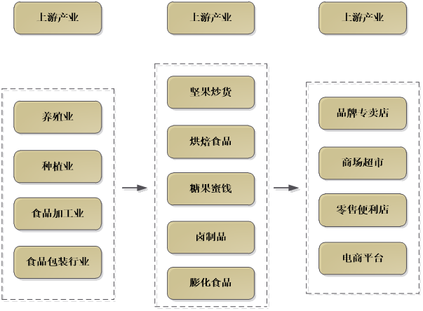 休閑食品行業(yè)的上游行業(yè)包括傳統(tǒng)農(nóng)業(yè)如種植業(yè)、養(yǎng)殖業(yè)、,食品添加劑、食品包裝行業(yè)。行業(yè)的下游主要是銷售環(huán)節(jié),通過(guò)多種渠道如大型商超、直營(yíng)店、經(jīng)銷商等進(jìn)行銷售,直面產(chǎn)品終端消費(fèi)者。