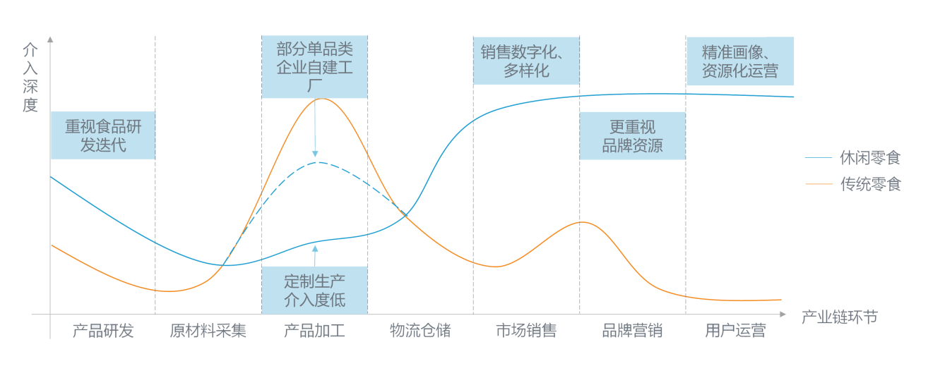 目前,市場(chǎng)上對(duì)休閑零食的劃分有五至十二個(gè)品類,每個(gè)品類之中又包含若干子品類,導(dǎo)致休閑零食的市場(chǎng)碎片化嚴(yán)重;傳統(tǒng)食品企業(yè)跨品類經(jīng)營(yíng)意味著重新購(gòu)置、配置一條生產(chǎn)線,成本巨大;同時(shí),部分休閑零食企業(yè)采用對(duì)外合作定制生產(chǎn)策略,僅發(fā)力于食品研發(fā)環(huán)節(jié),一定程度上改進(jìn)了以往重資產(chǎn)企業(yè)跨品類難度大的問(wèn)題,孕生了平臺(tái)型、多品類經(jīng)營(yíng)新業(yè)態(tài)。