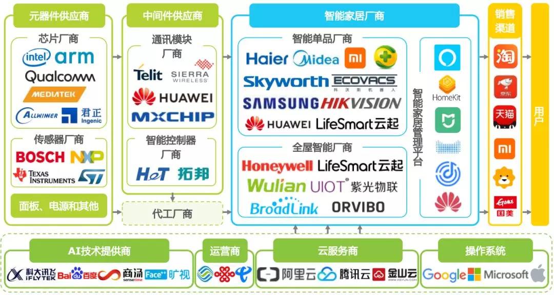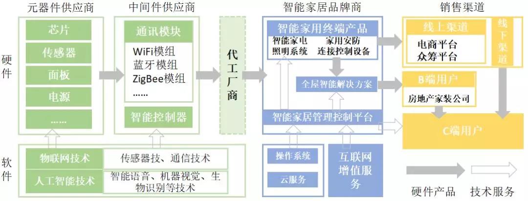 通常所指的智能家居企業(yè)為智能家居品牌商,涵蓋向最終用戶(hù)提供終端產(chǎn)品、解決方案和設(shè)備管理控制平臺(tái)的企業(yè),底層除物聯(lián)網(wǎng)操作系統(tǒng)、云服務(wù)作為管理控制平臺(tái)的支撐外,還包括內(nèi)容服務(wù)、生活服務(wù)等互聯(lián)網(wǎng)增值服務(wù)。智能家居產(chǎn)業(yè)鏈上游主要是芯片、傳感器等元器件供應(yīng),以及通訊模塊和智能控制器等中間件供應(yīng)商。品牌商可以通過(guò)線上、線下零售渠道直接向C端用戶(hù)銷(xiāo)售終端產(chǎn)品,也可以面向房地產(chǎn)、家裝公司等B端客戶(hù)提供整體解決方案。