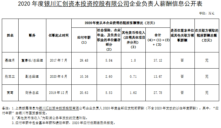 銀川匯創(chuàng)資本投資控股有限公司企業(yè)負(fù)責(zé)人2020年度薪酬情況