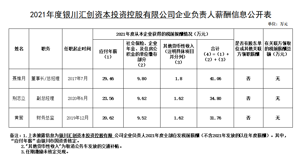 銀川匯創(chuàng)資本投資控股有限公司企業(yè)負(fù)責(zé)人2021年度薪酬情況